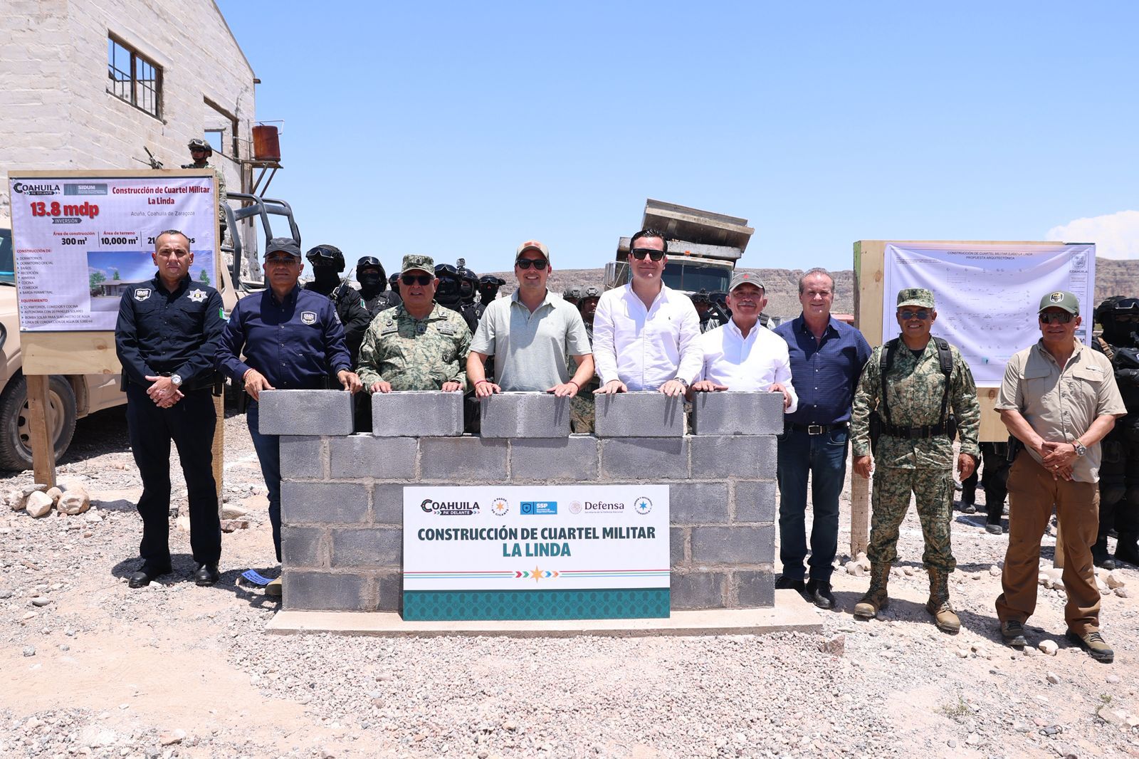 Al poner la primera piedra del cuartel militar en el ejido La Linda, ubicado entre Múzquiz, Acuña y Ocampo, en los límites con Estados Unidos, el gobernador Manolo Jiménez Salinas dio a conocer que van por 15 cuarteles para las fuerzas de seguridad en Coahuila, tanto para las estatales como militares, dentro del Programa de Infraestructura Estratégica para la Seguridad y el Blindaje del Estado, que tiene como objetivo consolidar la paz y la tranquilidad en todas las regiones del estado.