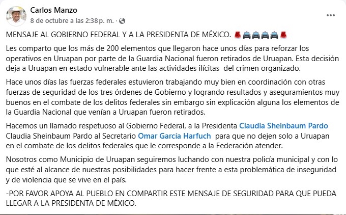 “En estos momentos nos están reportando que se está movilizando gente armada para entrar a Uruapan… Les pedimos que se resguarden hasta que existan condiciones de seguridad para levantar este código rojo“, alertó.
