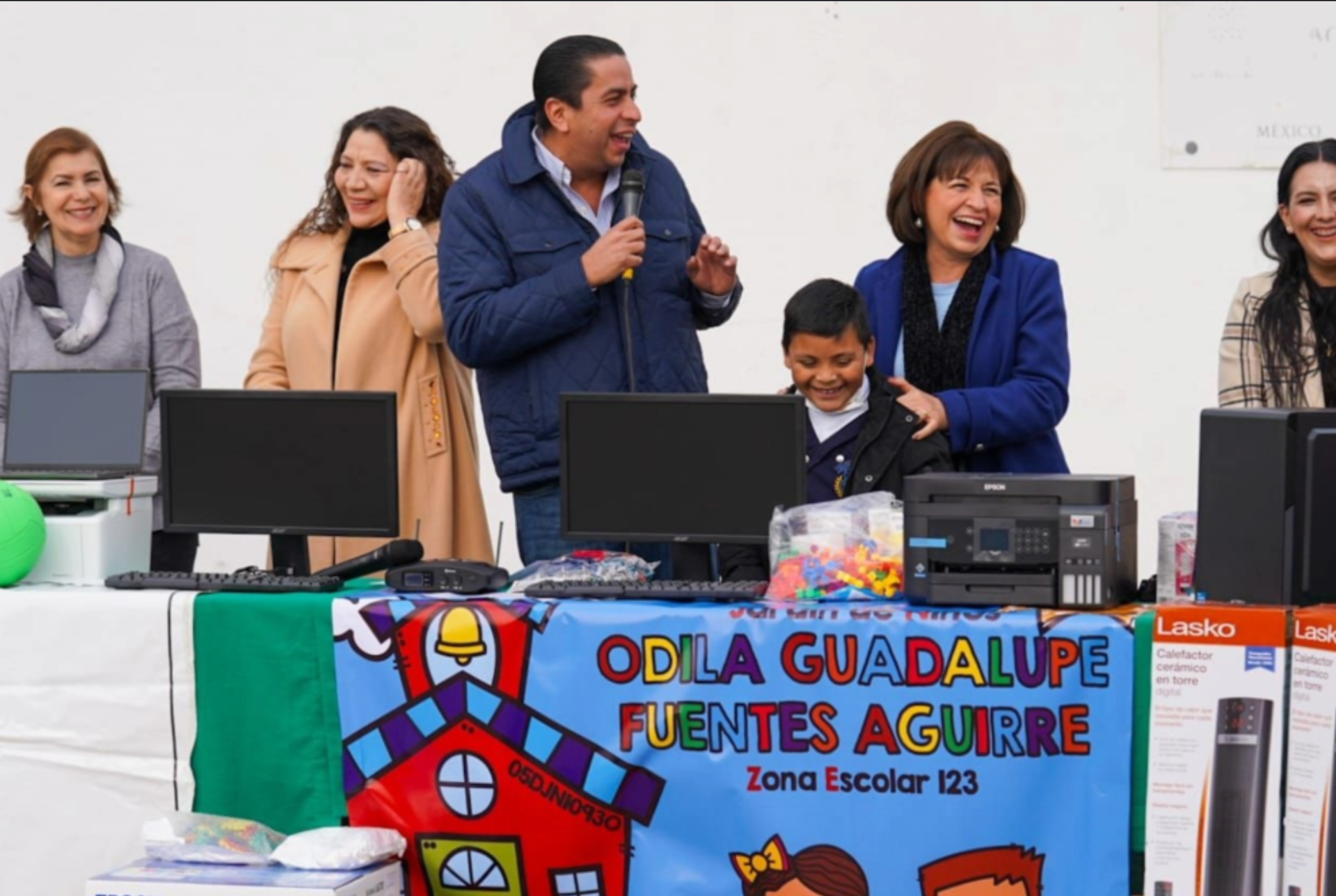 Mientras que, otros 50 mil pesos en equipo fueron entregados al Jardín de Niños “Odila Guadalupe Fuentes Aguirre” consistente en dos impresoras multifuncionales, seis cartuchos de tinta, una bocina grande, un paquete de micrófonos, una pantalla de 65 pulgadas, dos calentadores de torre y material didáctico.