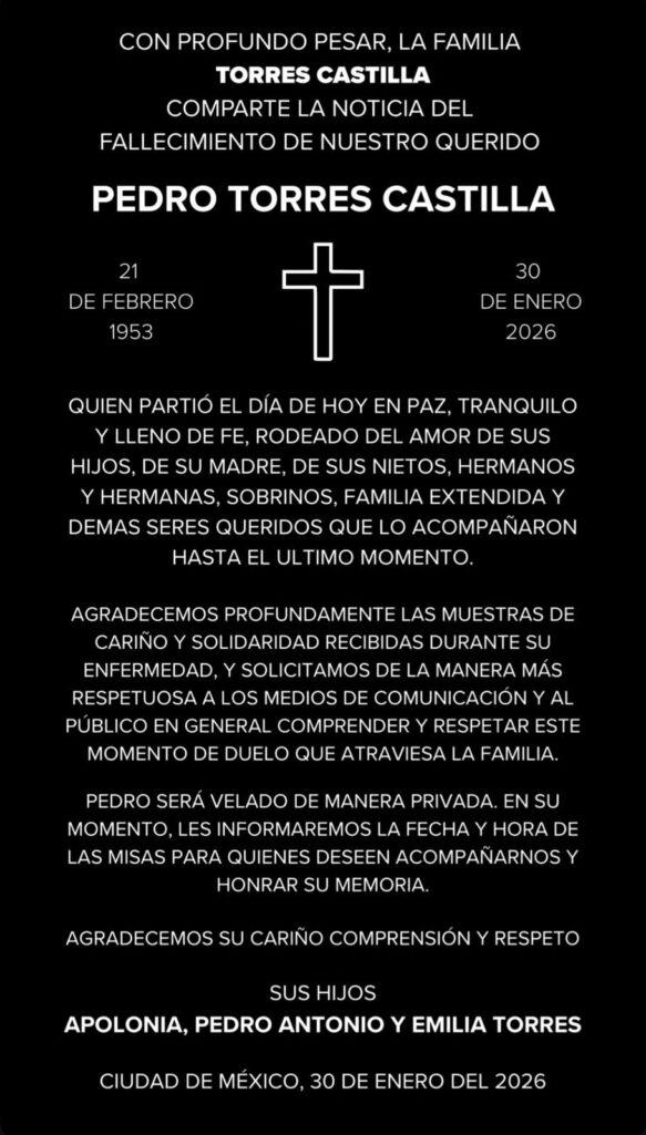 La madrugada de este viernes 30 de enero falleció el productor y director saltillense Pedro Torres Castilla a los 72 años de edad, informaron sus hijos a través de un comunicado difundido en redes sociales. La noticia generó múltiples expresiones de pesar en el ámbito cultural y televisivo, donde su nombre es considerado referente de la industria audiovisual en México.