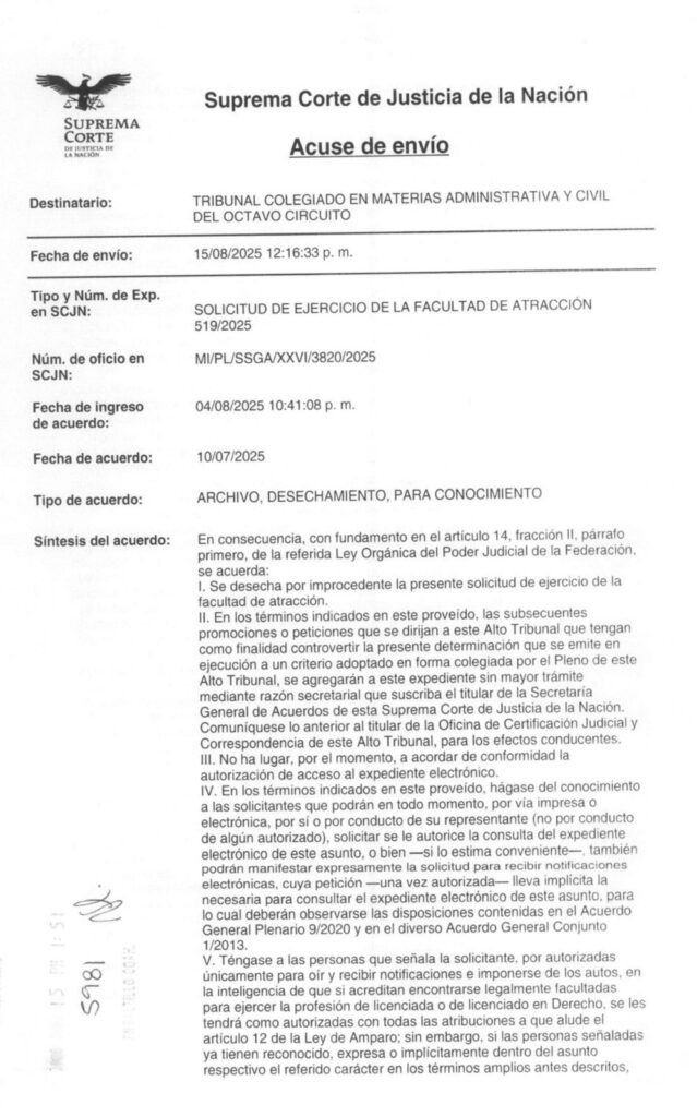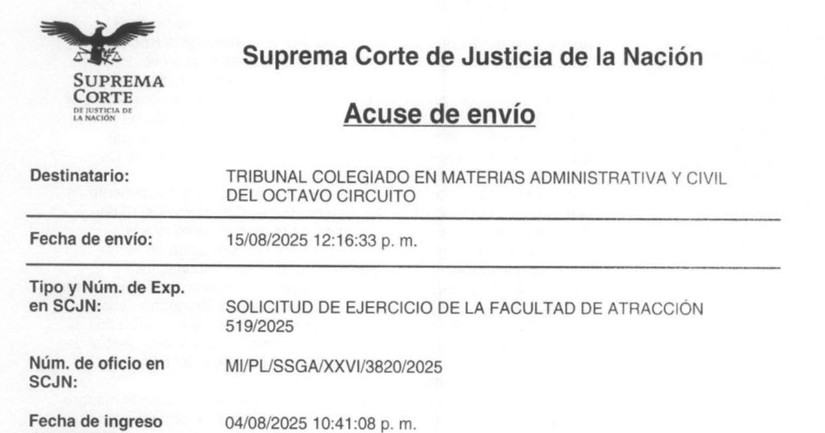 Hoy leí la columna de un opinólogo de Vanguardia —no me pregunten su nombre, no lo recuerdo— que dice que “esperan que la Suprema Corte de la Nación atraiga el caso y que un recurso anule la sentencia”. Sin embargo, por documentos que nos han llegado, está claro: la Suprema Corte rechazó atraer el caso Vanguardia, y otro documento reciente indica que ese “recurso salvador” fue desechado.