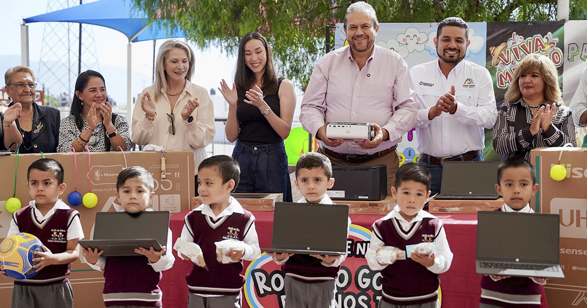 En esta ocasión, el beneficio llegó al Jardín de Niños en mención, de la colonia Parajes de los Pinos, con el apoyo que incluyó laptops, proyectores, pantallas inteligentes, bocinas, impresora y dispensador de agua, en apoyo a los turnos matutino y vespertino, donde se forman 310 niñas y niños.
