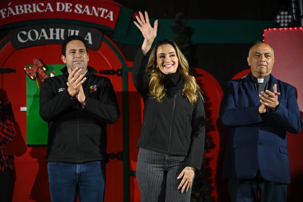 El alcalde de Saltillo, Javier Díaz González, junto a su esposa, Luly López Naranjo y la presidenta honoraria del DIF Coahuila, Liliana Salinas Valdés, encabezó el encendido del Pino Navideño y la inauguración de Villamagia 2025 en la Plaza de Armas.
