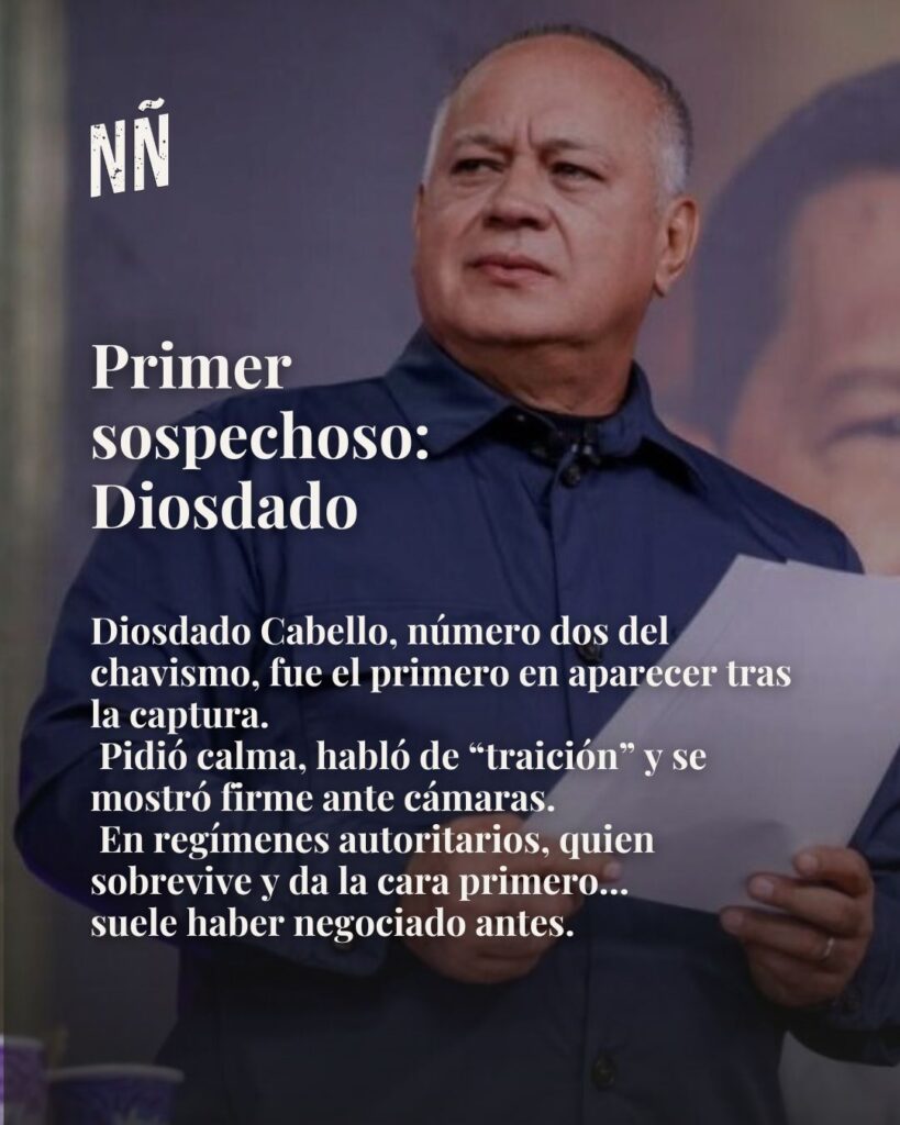 - Diosdado Cabello: El “número dos” del chavismo, ministro del Interior y hombre fuerte de las fuerzas coercitivas. Fue uno de los primeros en aparecer públicamente tras la captura, en un video rodeado de policías llamando a la calma y condenando la “traición”. En regímenes autoritarios, quien se muestra primero y más firme suele ser sospechoso de haber negociado su supervivencia. Cabello tiene su propia recompensa estadounidense (hasta 25 millones) y un poder paralelo al de Maduro. Su rápida visibilidad contrasta con el silencio inicial de otros.