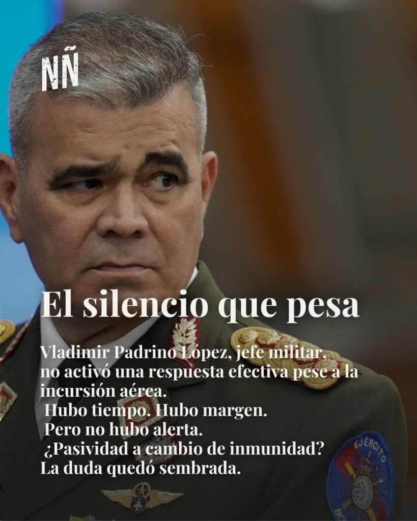 - Vladimir Padrino López: Ministro de Defensa y jefe de la Fuerza Armada, responsable directo de la seguridad nacional. Es llamativo que no se activara una respuesta efectiva ante la violación del espacio aéreo: helicópteros y aviones estadounidenses tuvieron al menos 15-20 minutos de margen sin interferencia significativa. ¿Por qué no le avisó a Maduro “Ya entraron los gringos”? Tiempo con el que Maduro hubiera llegado a su búnker protegido por la FANB, pero no lo logró. Padrino apareció después denunciando la “agresión”, pero sin mencionar explícitamente la captura en sus primeras declaraciones. Con una recompensa de 15 millones sobre su cabeza, ¿pudo haber optado por la pasividad a cambio de inmunidad? Su lealtad siempre fue clave para Maduro, pero la inacción plantea dudas.