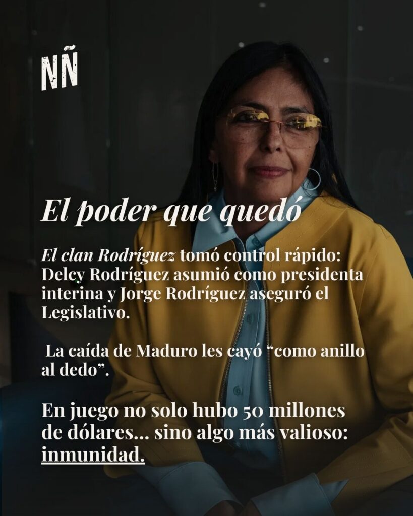 - El clan Rodríguez (Delcy y Jorge): La vicepresidenta Delcy Rodríguez asumió rápidamente como presidenta interina, respaldada por una decisión express del Tribunal Supremo chavista. Su hermano Jorge, presidente de la Asamblea Nacional, completa el dúo. Analistas señalan que la caída de Maduro “les cayó como anillo al dedo”: ahora controlan el Ejecutivo y el Legislativo sin el peso del líder máximo. Delcy apareció en TV afirmando que Maduro sigue siendo el único presidente, pero luego suavizó el tono hacia Washington, abriendo posibilidad de diálogo. ¿Negociaron ellos la entrega a cambio de mantenerse en el poder?