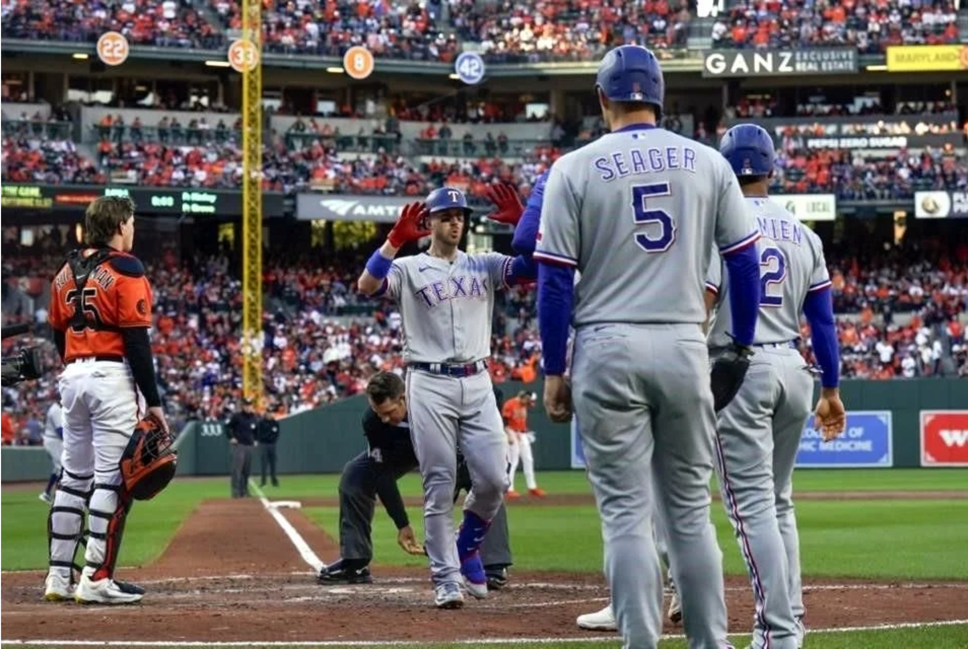 Texas se vio en desventaja por primera vez esta postemporada cuando los Orioles anotaron dos carreras en la primera entrada, pero los Rangers respondieron con cinco en la segunda para retirar del juego al novato Grayson Rodriguez. Garver, un receptor suplente que no había jugado en los Playoffs este año, pegó el grand slam que puso la pizarra 9-2.