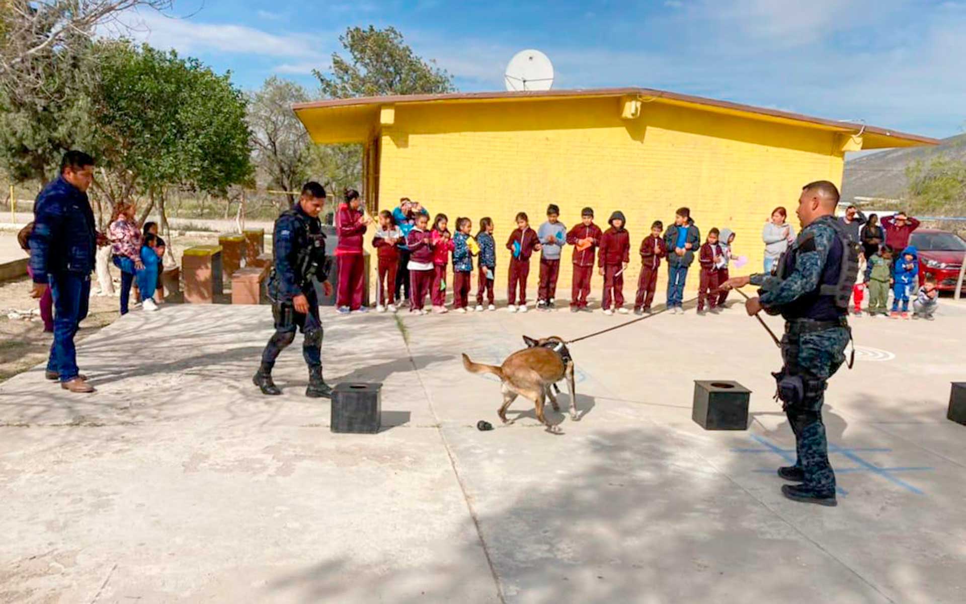 Los elementos de la corporación se reunieron con alrededor de 27 alumnos de la Escuela Primaria “Victoriano Cepeda” y del preescolar CONAFE a fin de hacer una demostración de las tareas a cargo de “Billy”, el Pastor Belga Malinois que encabeza el binomio canino.